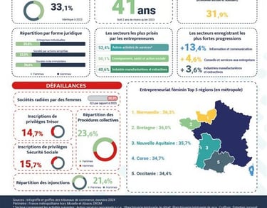 En 2024, les femmes représentent 33,1 % des nouvelles immatriculations d’entreprises, le même taux qu’en 2023, confirmant ainsi la solidité de leur présence dans l’écosystème entrepreneurial (infogreffe.fr).