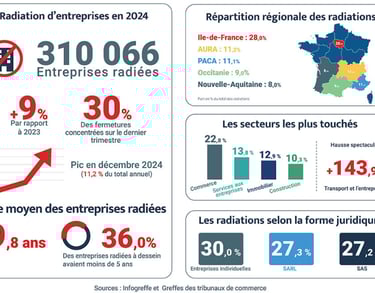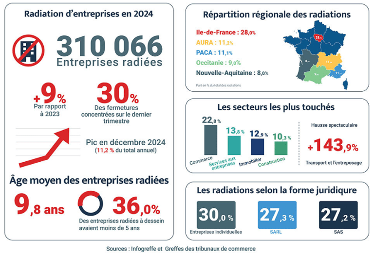 Après une baisse marquée en 2023 (-17,9 %), les radiations d’entreprises ont connu un net rebond en 2024 (+9 %), atteignant 310 066 cessations d’activité.